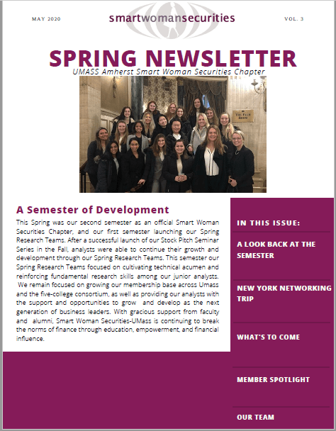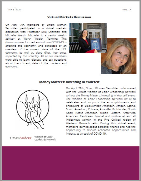 Michelle's involvement with the UMass Amherst Smart Woman Securities Chapter was highlighted in their spring newsletter. She was pleased to participate in a virtual markets discussion on Covid-19 and its effect on the economy and market volatility. Click here to read more>>